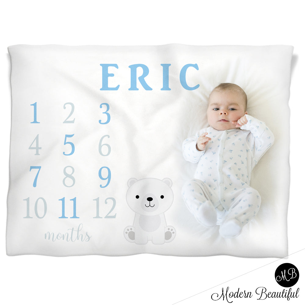 Polar Bear Milestone Baby Blanket Personalized Boy Baby Growth Photo Blanket