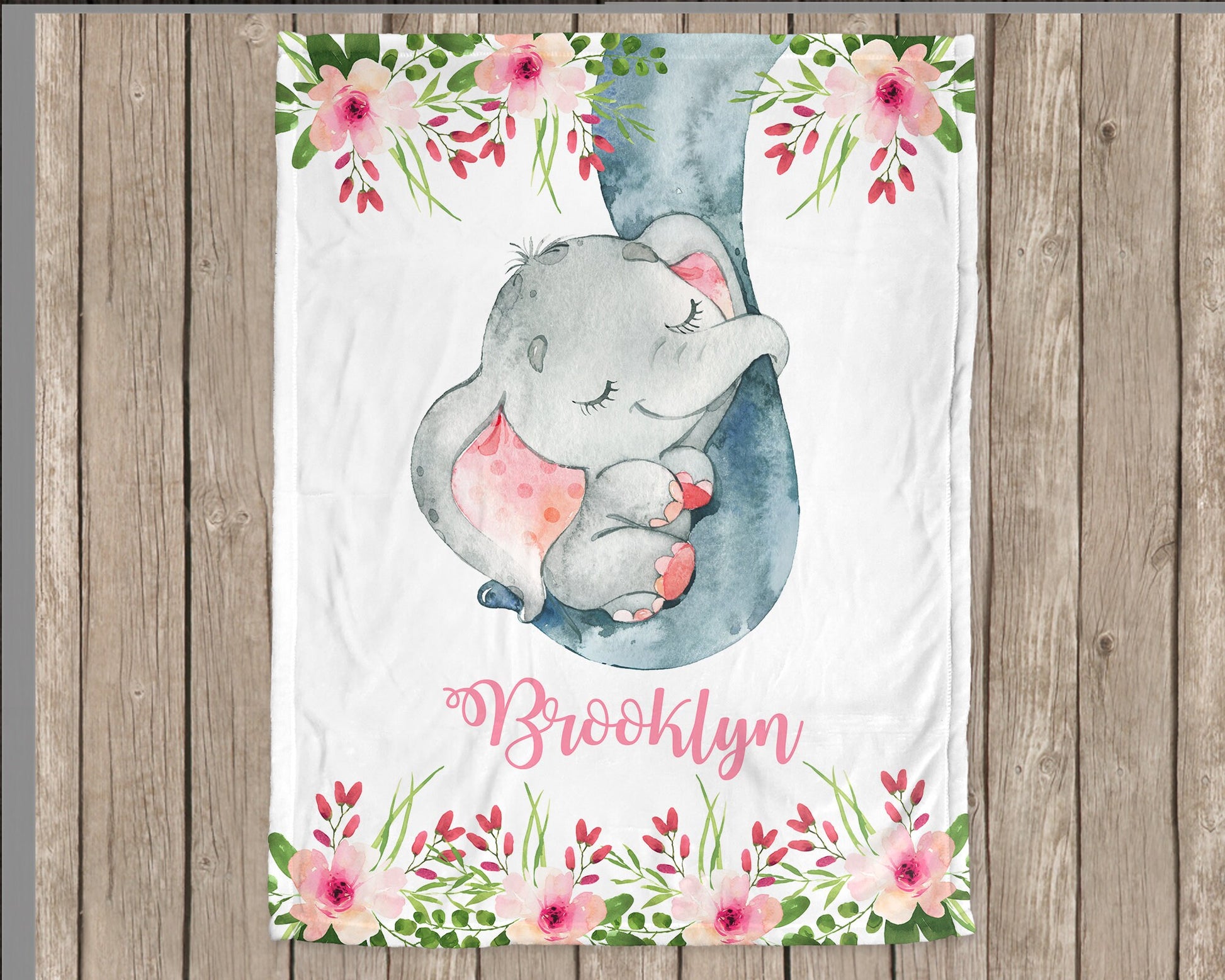 Personalized Baby Elephant Pink Flowers Baby Name Blanket Girl