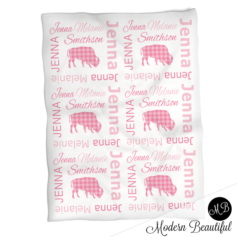 Personalized Buffalo Baby Name Blanket Girl Pink