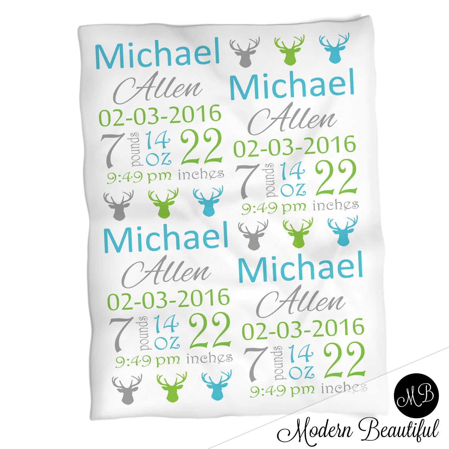 Deer antler baby boy stats blanket, blue and green, antler boy baby blanket, personalized deer baby blanket, baby stats blanket, boy or girl stats swaddle blanket, baby shower gift, choose colors.