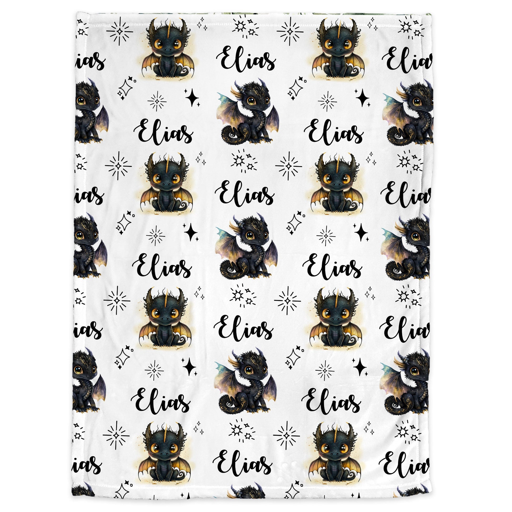 Personalized dragon baby name blanket that includes child's name in black, or your choice of color.