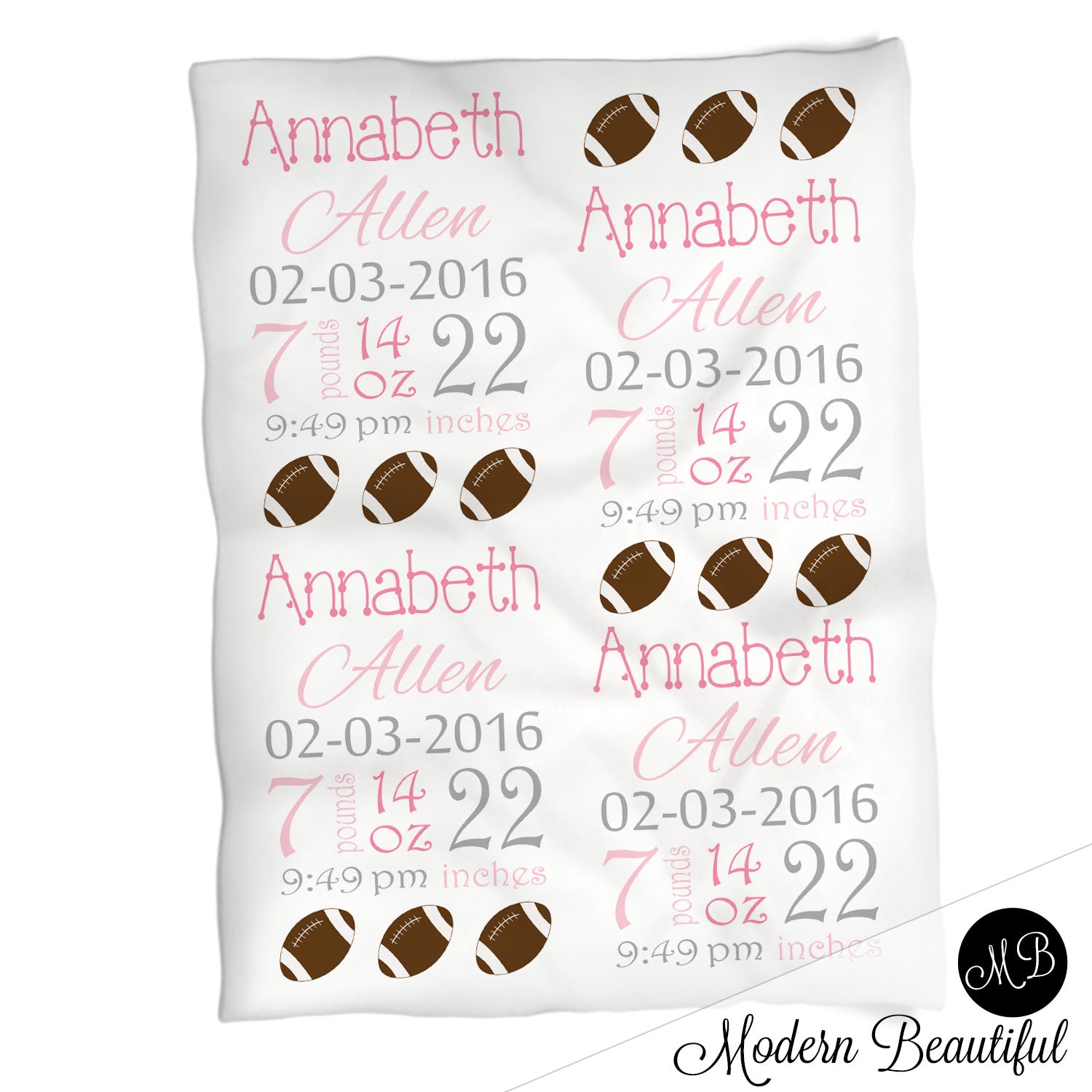 Football baby girl stats blanket, pink and gray, football girl baby blanket, personalized football baby blanket, baby stats blanket, boy or girl stats swaddle blanket, baby shower gift, choose colors.