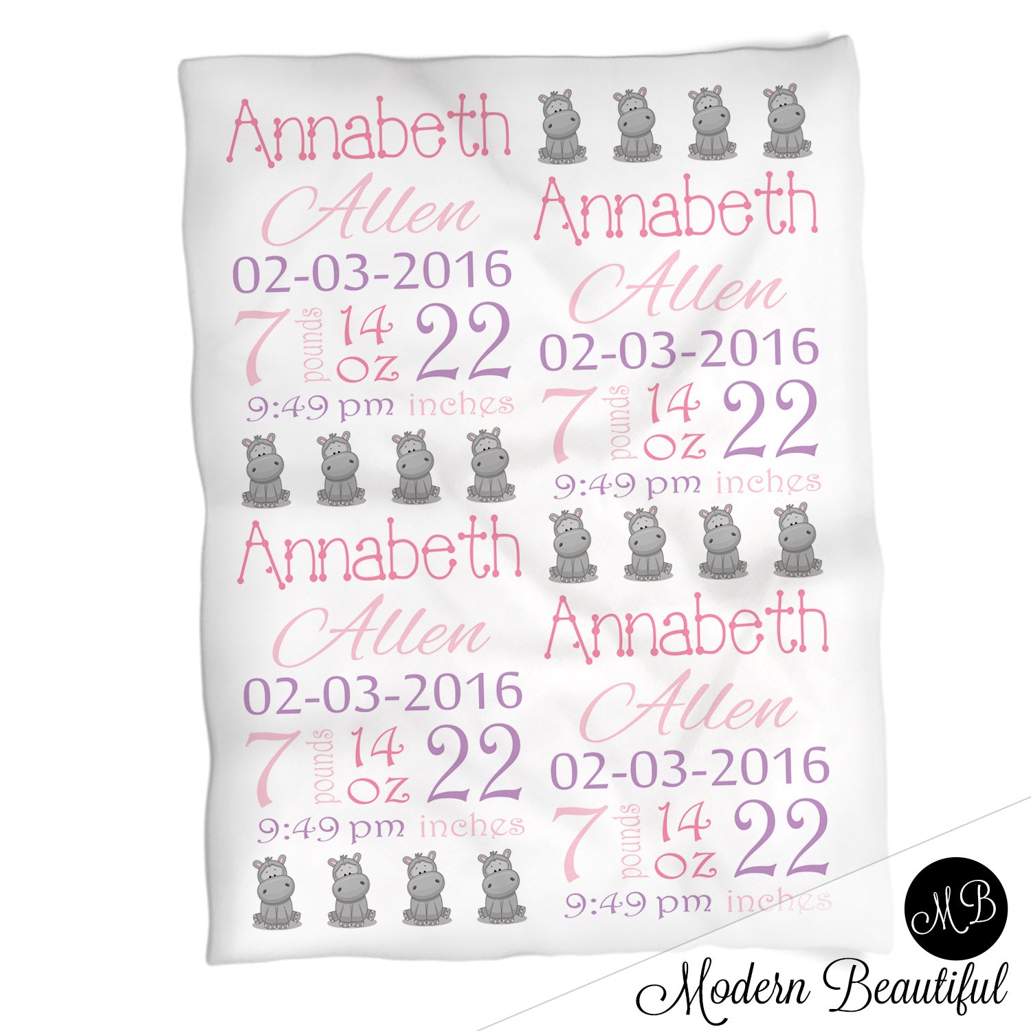 Hippo baby girl stats blanket, pink and gray, hippo girl baby blanket, personalized hippo baby blanket, baby stats blanket, boy or girl stats swaddle blanket, baby shower gift, choose colors.