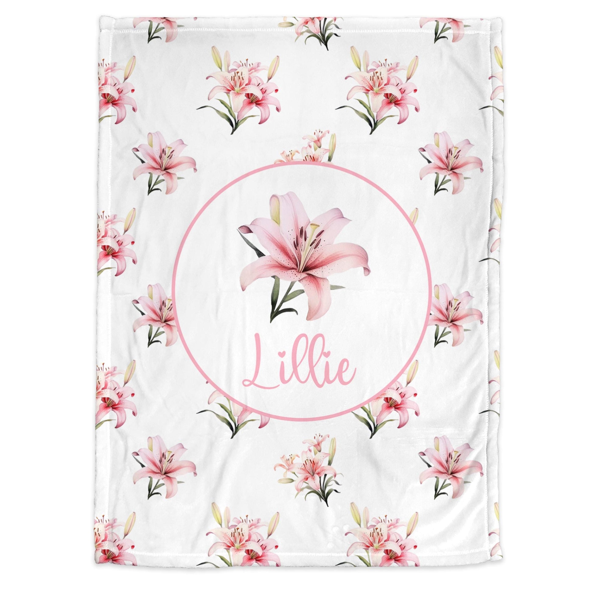 This personalized lily flower baby name blanket makes a great gift for baby girl's nursery with baby's name and pink lily in circle on a background of lilies.