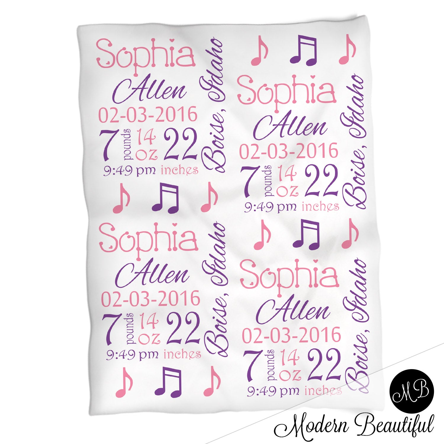 Music note baby girl stats blanket, purple and pink, music note girl baby blanket, personalized music baby blanket, baby stats blanket, boy or girl stats swaddle blanket, baby shower gift, choose colors.
