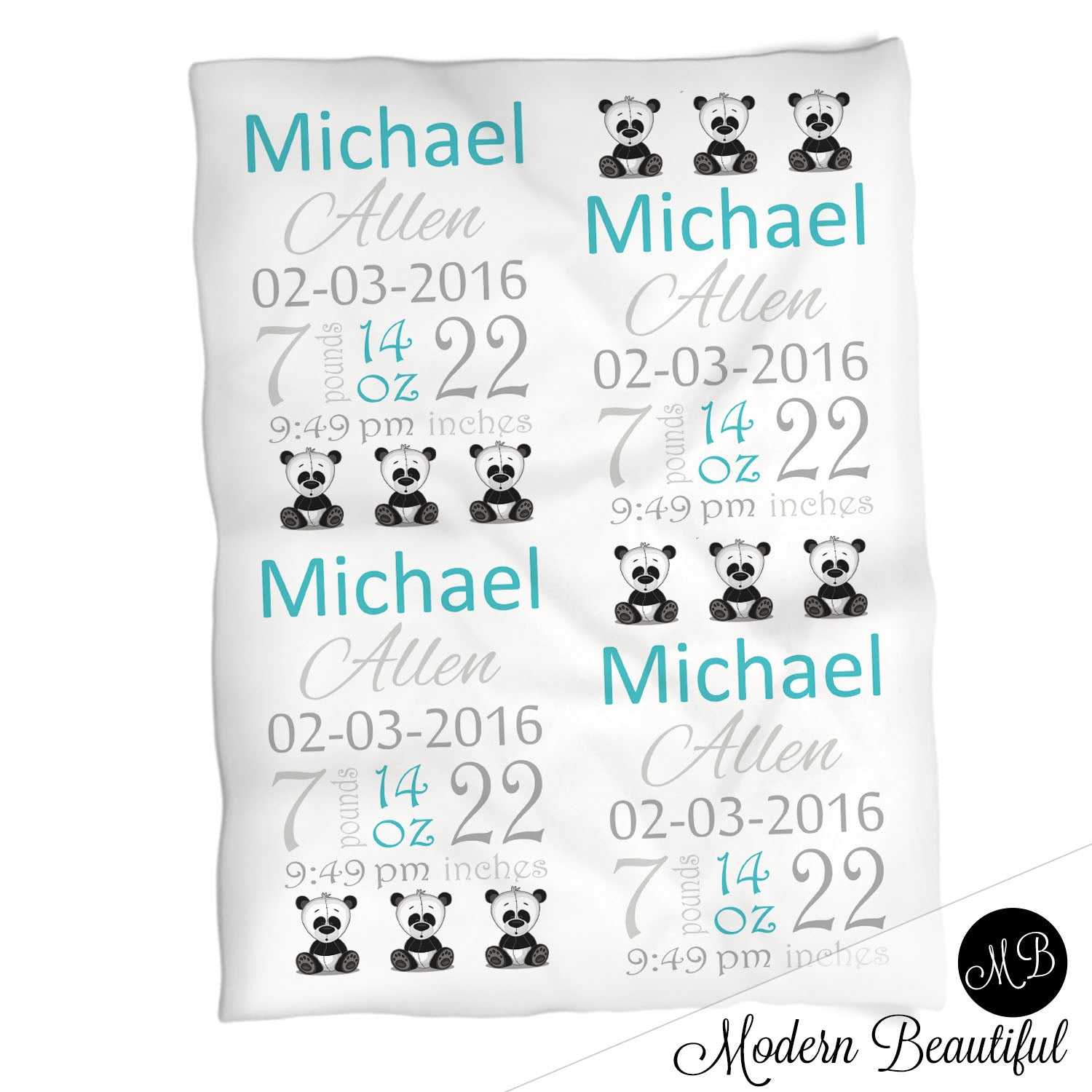Panda bear baby boy stats blanket, blue and gray, panda boy baby blanket, personalized panda bear baby blanket, baby stats blanket, boy or girl stats swaddle blanket, baby shower gift, choose colors.
