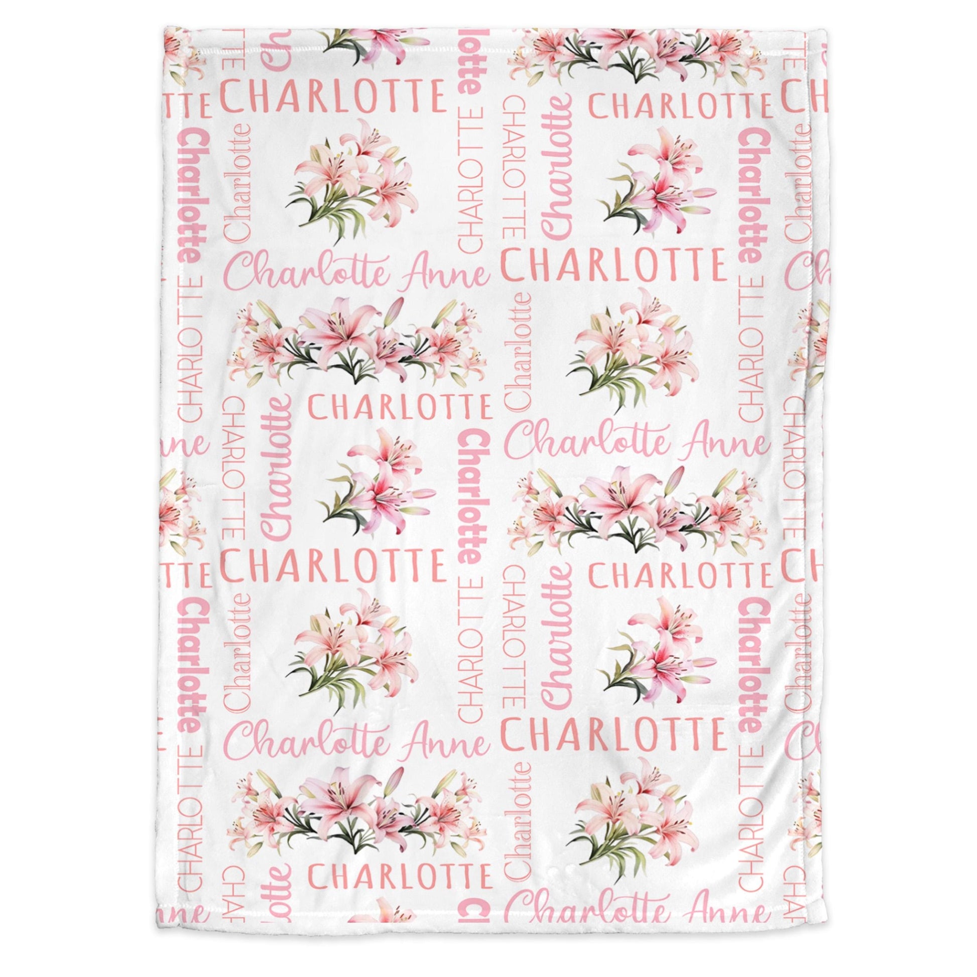 This personalized lily flower baby name blanket makes a great gift for baby girl's nursery.