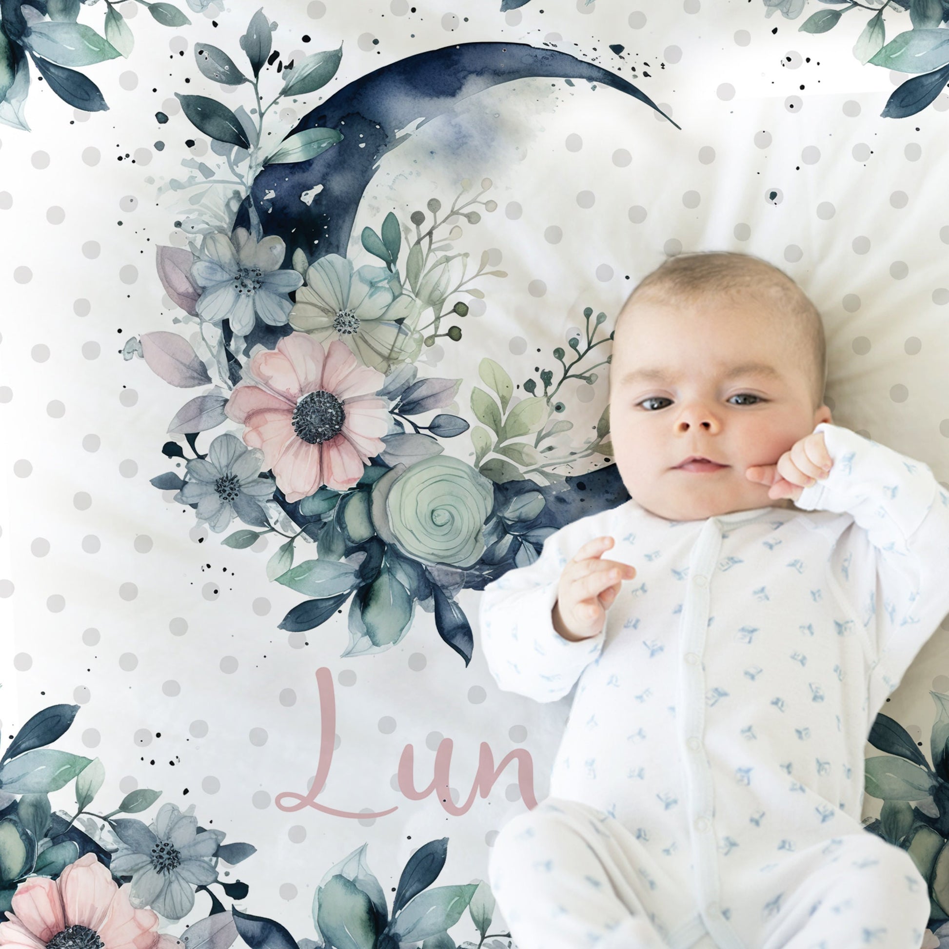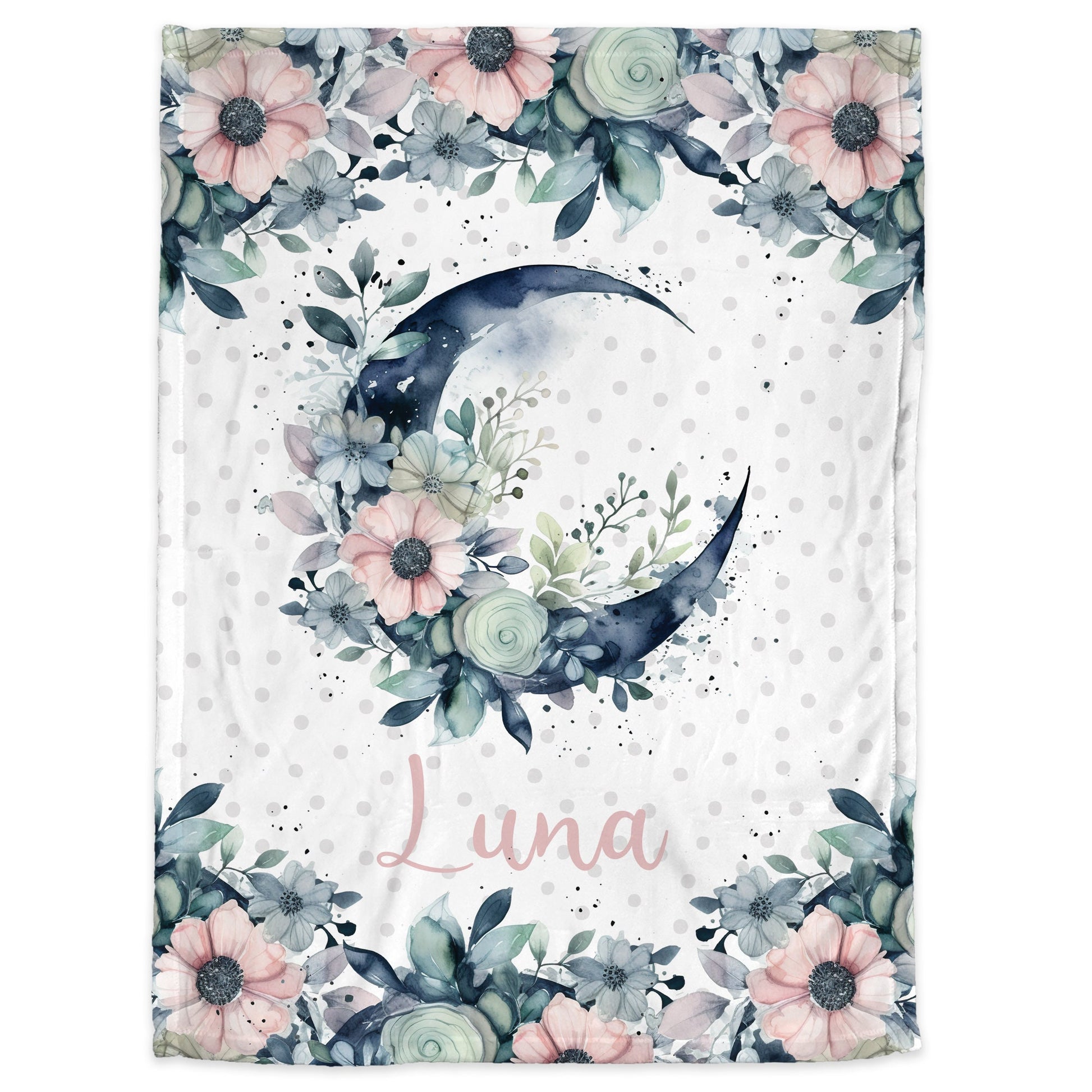 This moon and flowers baby name blanket features pink flowers with gray-blue toned leaves and moon with polka dot background and name in pink.