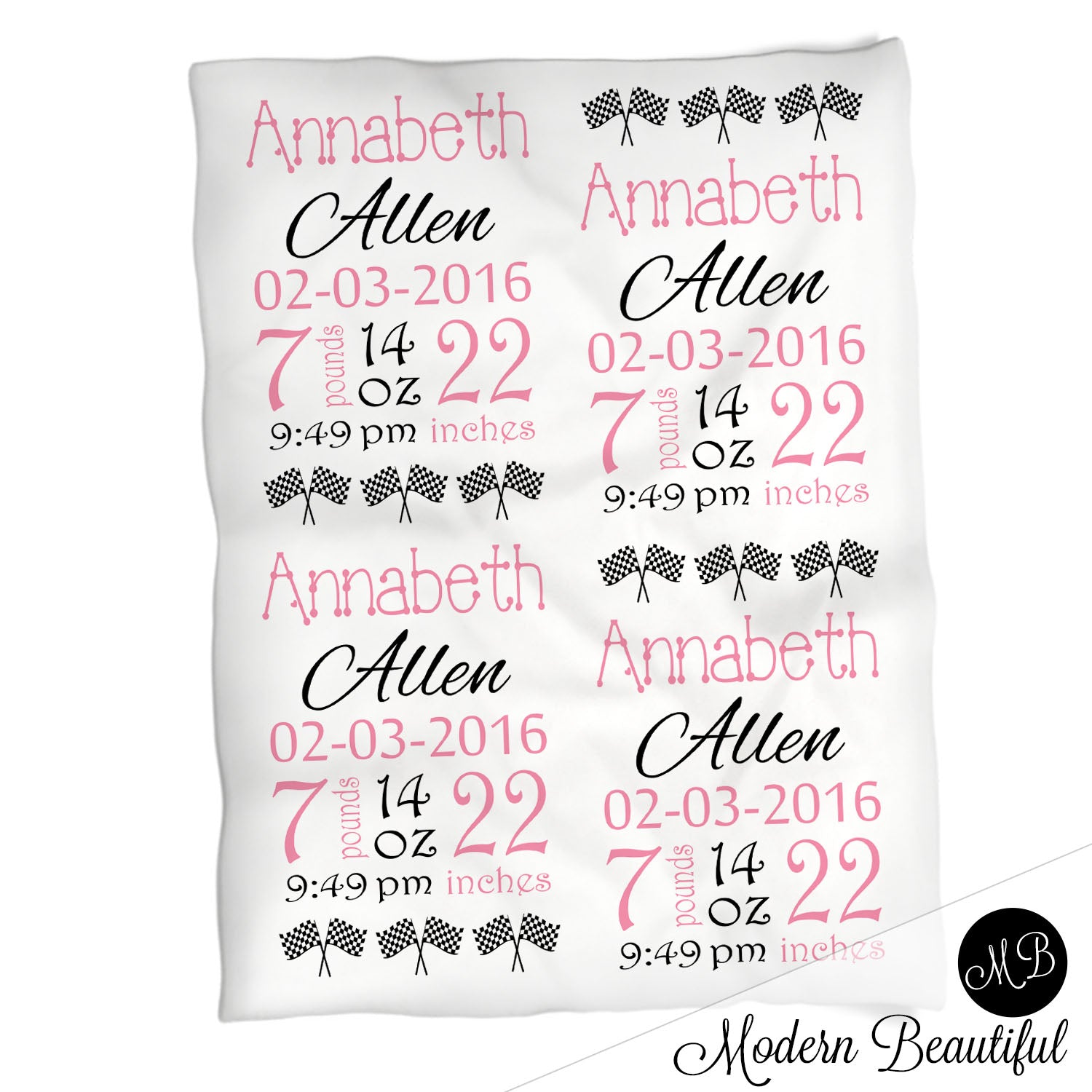 Racing baby girl stats blanket, pink and black, race flag girl baby blanket, personalized drag racing baby blanket, baby stats blanket, boy or girl stats swaddle blanket, baby shower gift, choose colors.