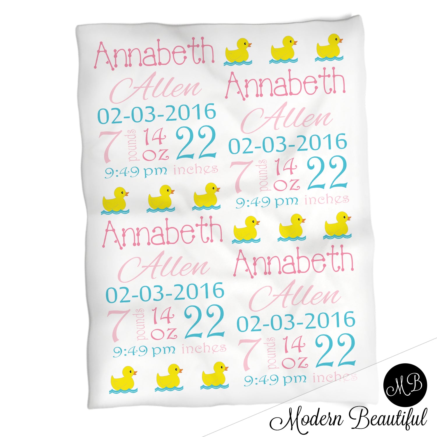 Rubber duck baby girl stats blanket, blue and pink, duck girl baby blanket, personalized rubber ducky baby blanket, baby stats blanket, boy or girl stats swaddle blanket, baby shower gift, choose colors.