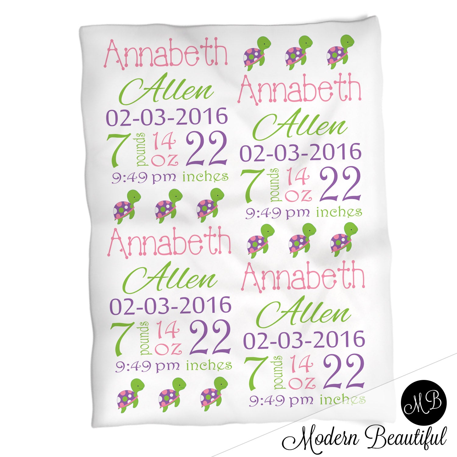 Sea turtle baby girl stats blanket, pink and purple, turtle girl blanket, personalized sea turtle baby blanket, baby stats blanket, boy or girl stats swaddle blanket, baby shower gift, choose colors.