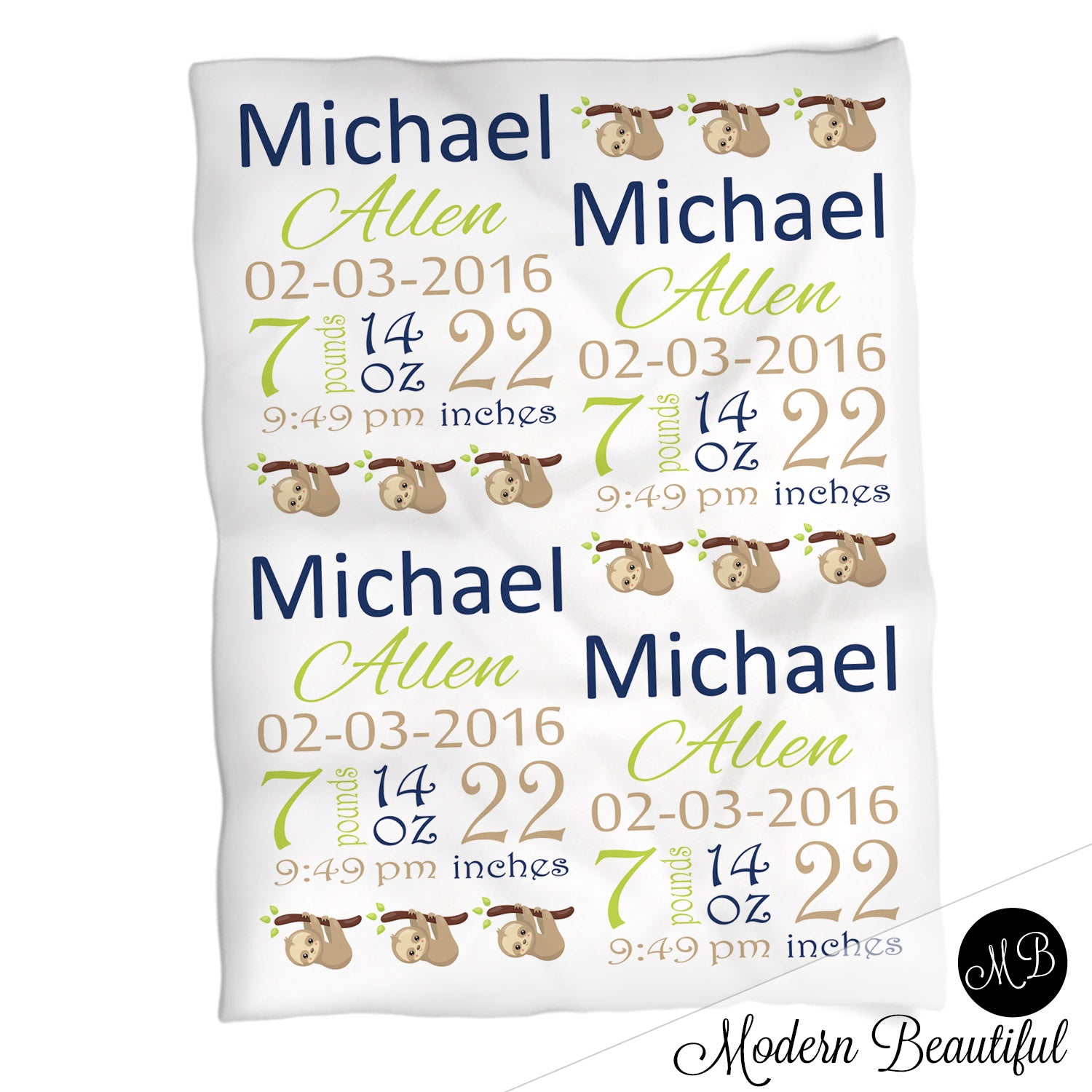 Sloth baby boy stats blanket, green and blue, sloth boy baby blanket, personalized sloth bear baby blanket, baby stats blanket, boy or girl stats swaddle blanket, baby shower gift, choose colors.
