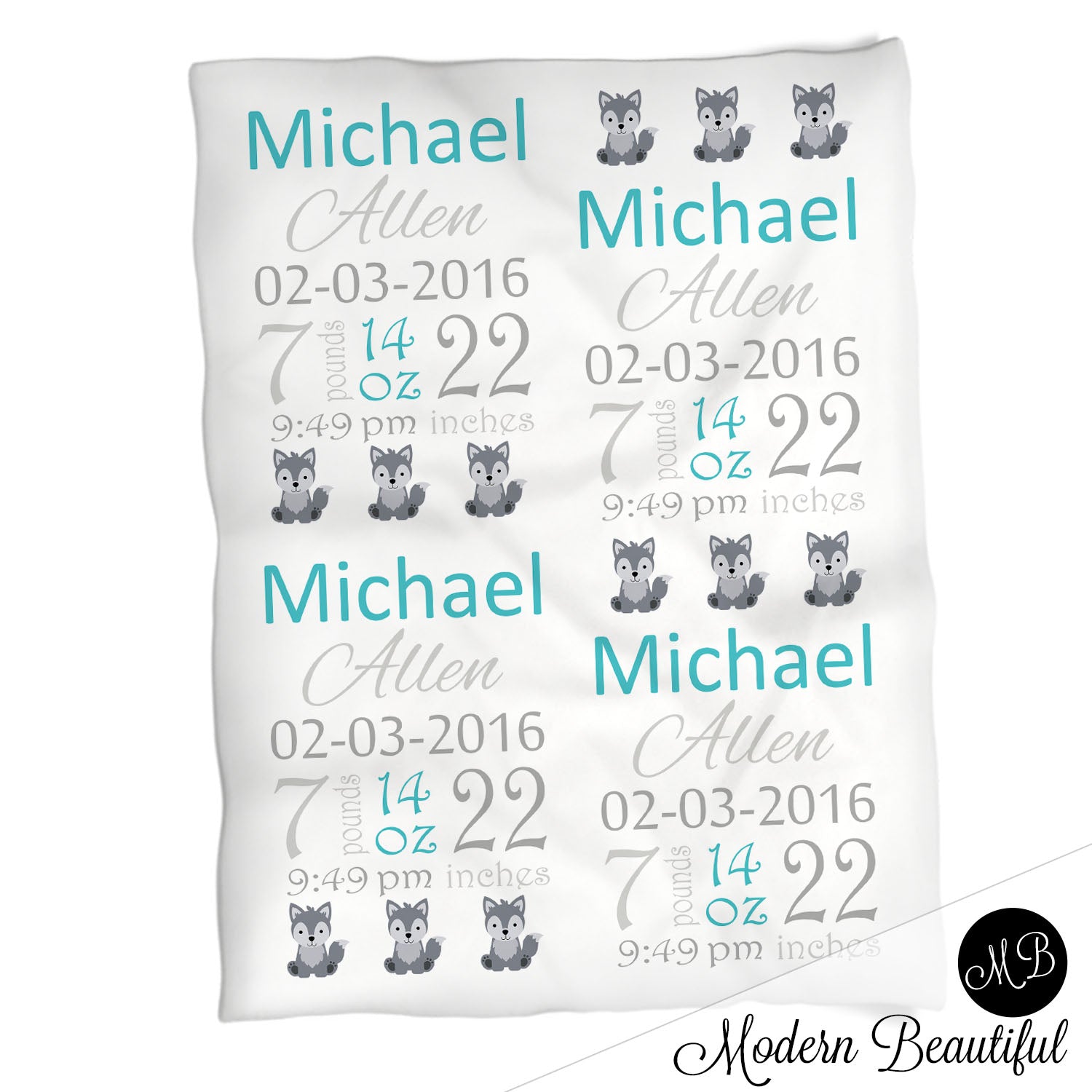 Wolf baby boy stats blanket, blue and gray, wolf boy baby blanket, personalized wolf baby blanket, baby stats blanket, boy or girl stats swaddle blanket, baby shower gift, choose colors.
